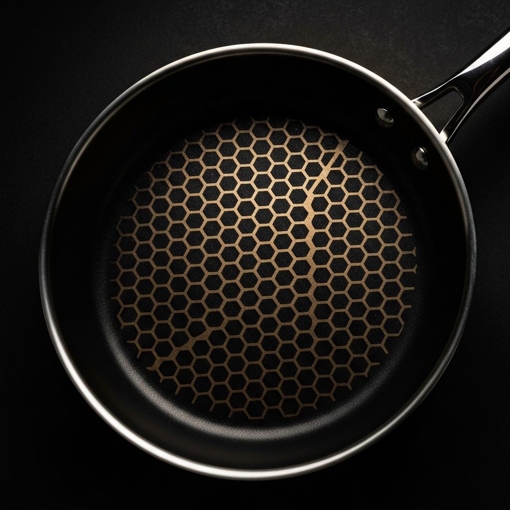 Under magnification, the genius of Gordon Ramsay cookware becomes immediately clear. Thousands of precisely-sized hexagons are laser-etched into the surface — each one creating a raised stainless steel peak surrounded by a recessed non-stick valley. The result is a cooking surface that performs two completely different functions simultaneously.